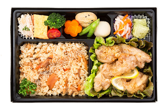 ご注文は2日前 12:00まで 1種類につき5個以上より承ります。【ごはん】かしわ飯(国産)220g、たけのこ、椎茸、人参、ごま、パセリ【おかず】塩唐揚げ、レモン、サニーレタス玉子焼き、煮物(里芋、人参、いんげん)、たけのこ土佐煮、ごぼうサラダ、信田煮、ブロッコリー、ミニトマト、漬物