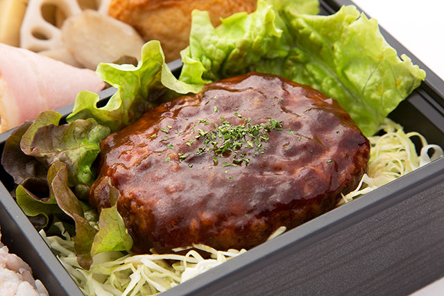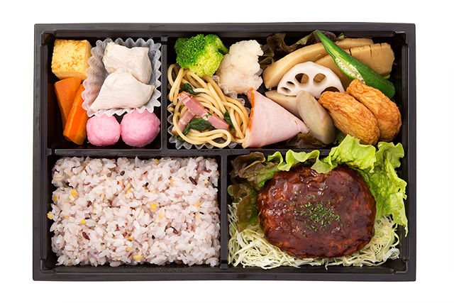 ご注文は2日前 12:00まで 1種類につき5個以上より承ります。【ごはん】十八穀米【おかず】<主菜>デミグラスハンバーグ<副菜>キャベツ、レタス、ニンジン、オクラ、玉子焼、ブロッコリー、カリフラワー、鶏むね肉、パスタ、ごぼう、レンコン、ハム、かまぼこ、さつまあげ